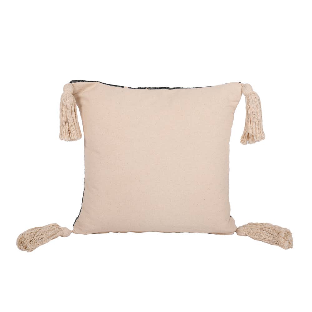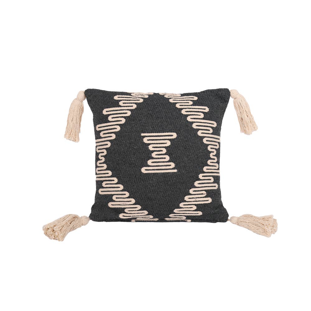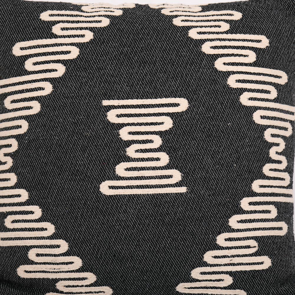 Rope pattern on black cotton 18x18". Polyfill insert. Indoor use only, do not expose to direct sunlight. Spot clean.