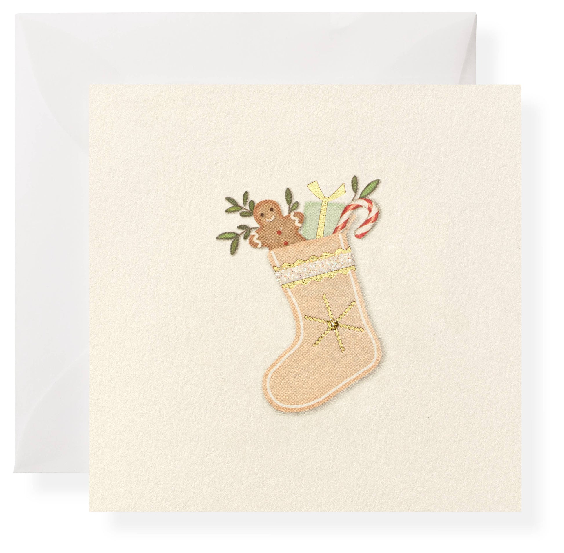 Sweet Christmas Stocking Gift Enclosure card is printed and hand-glittered in Memphis, TN. Paired with a vellum envelope. Book-folded enclosure card, blank on the inside. Dimensions | 3 x 3 inches.