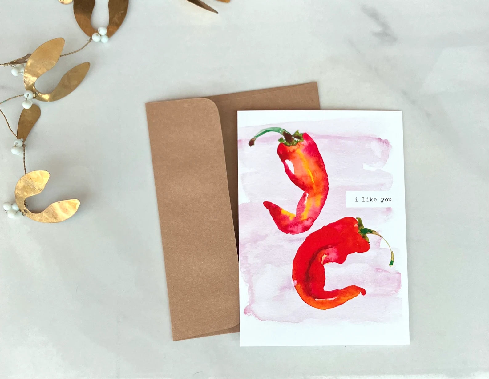 Two curvy red chile peppers with a purple background wash and typewritten “I like you” message. Printed on a 5x7" white folded card with a white paper envelope.