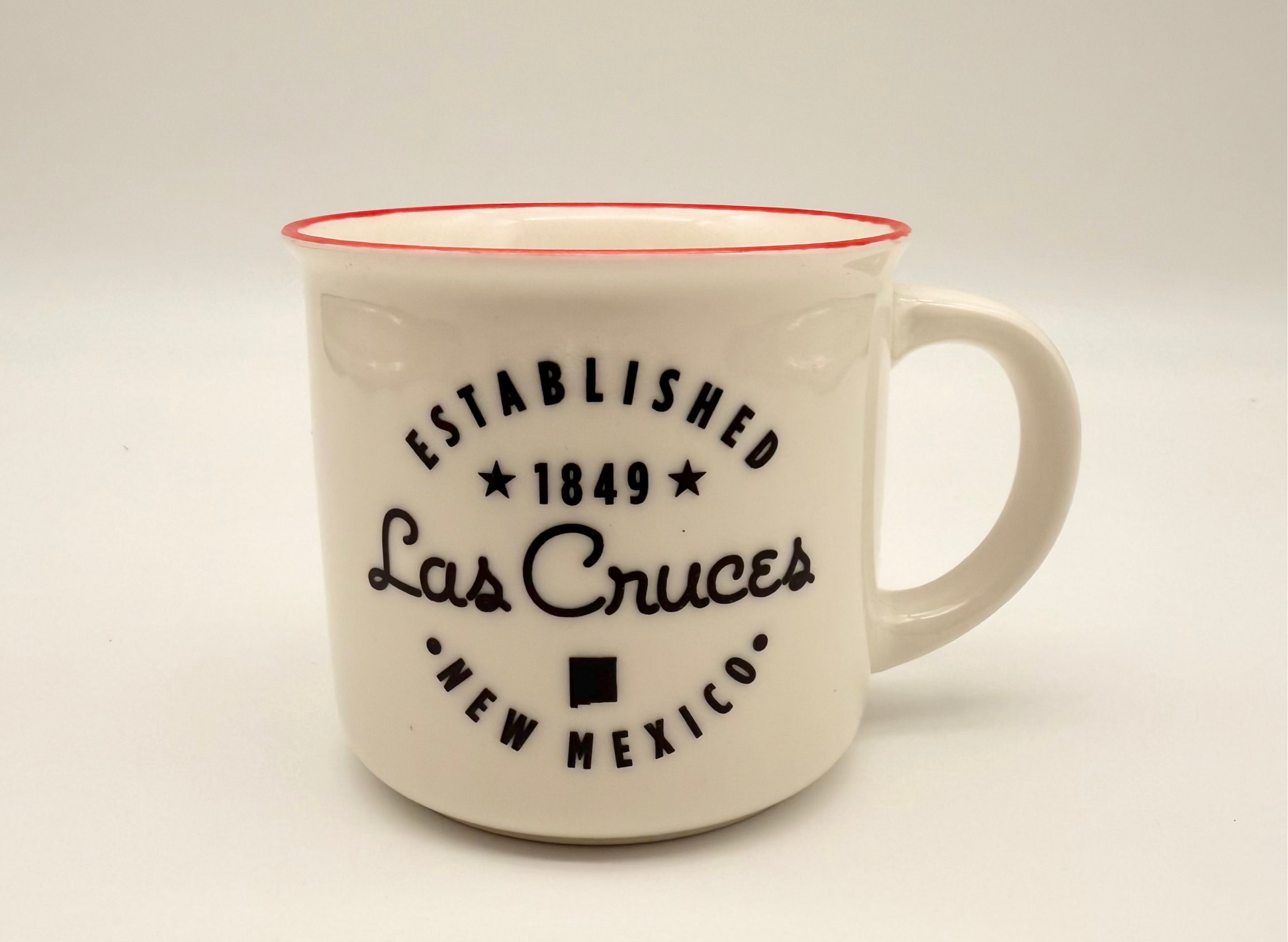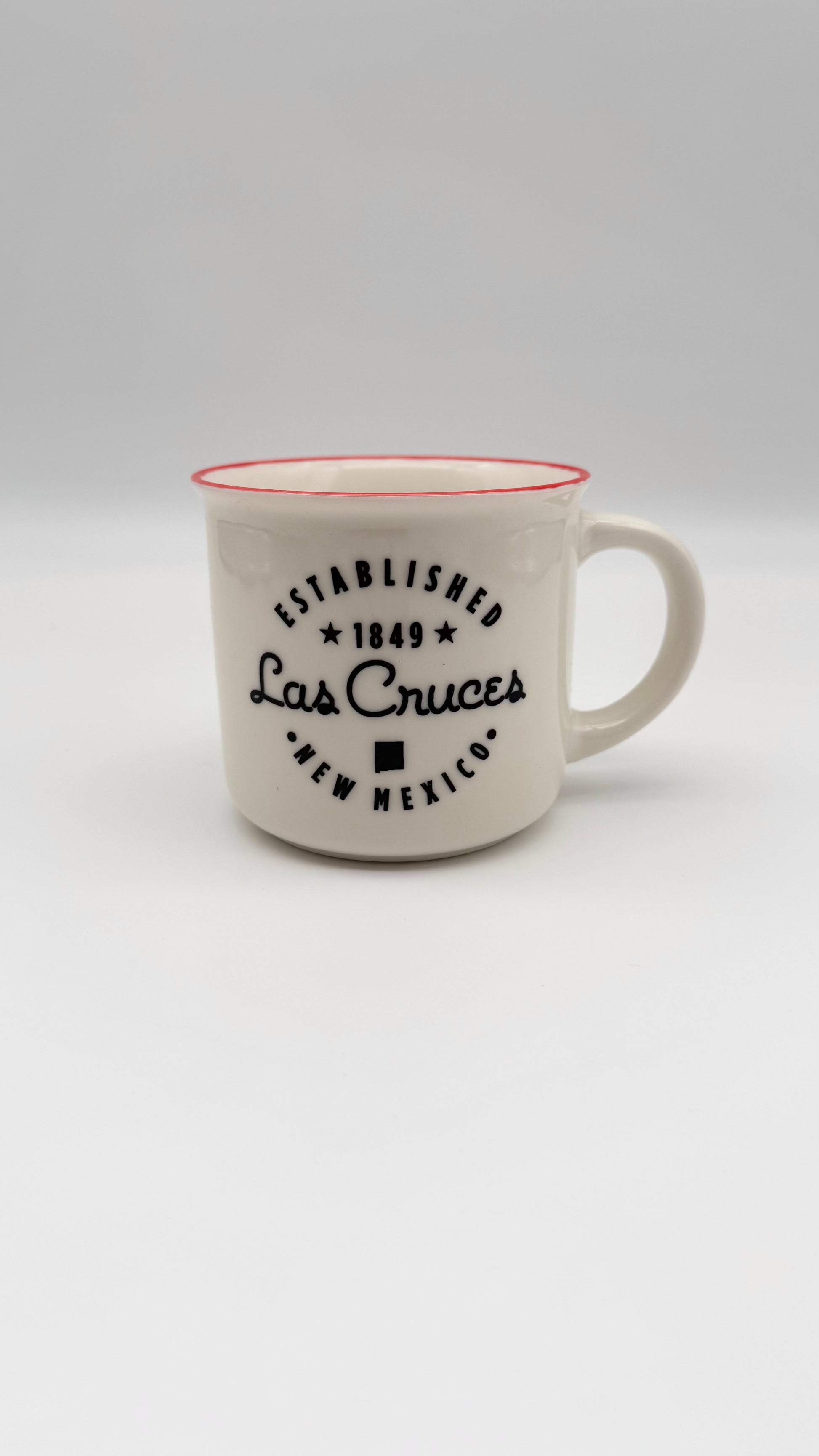 Show off your Las Cruces pride with this "established" 13oz ceramic camper style mug with a bright red lip.