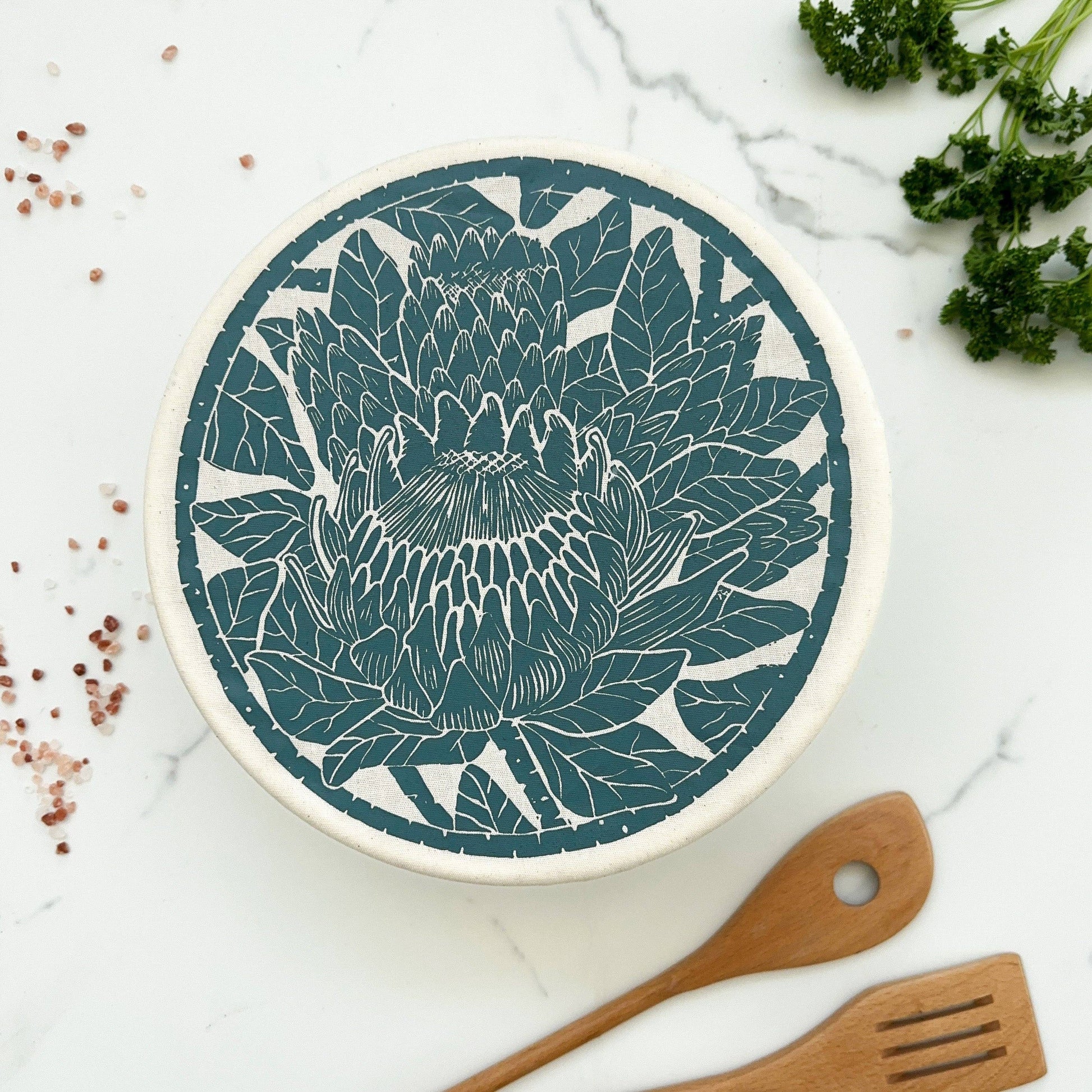 100% GOTS certified organic cotton. Breathable cover which limits condensation. Great alternative for single-use plastics and foils. Microwave safe. Handmade by women working in home industries on the outskirts of Cape Town, South Africa.Â