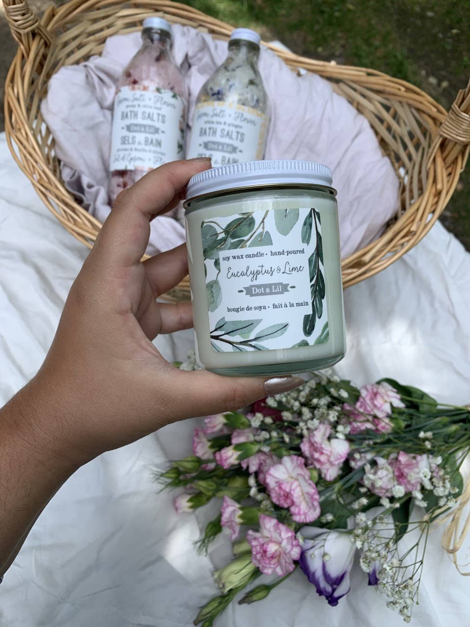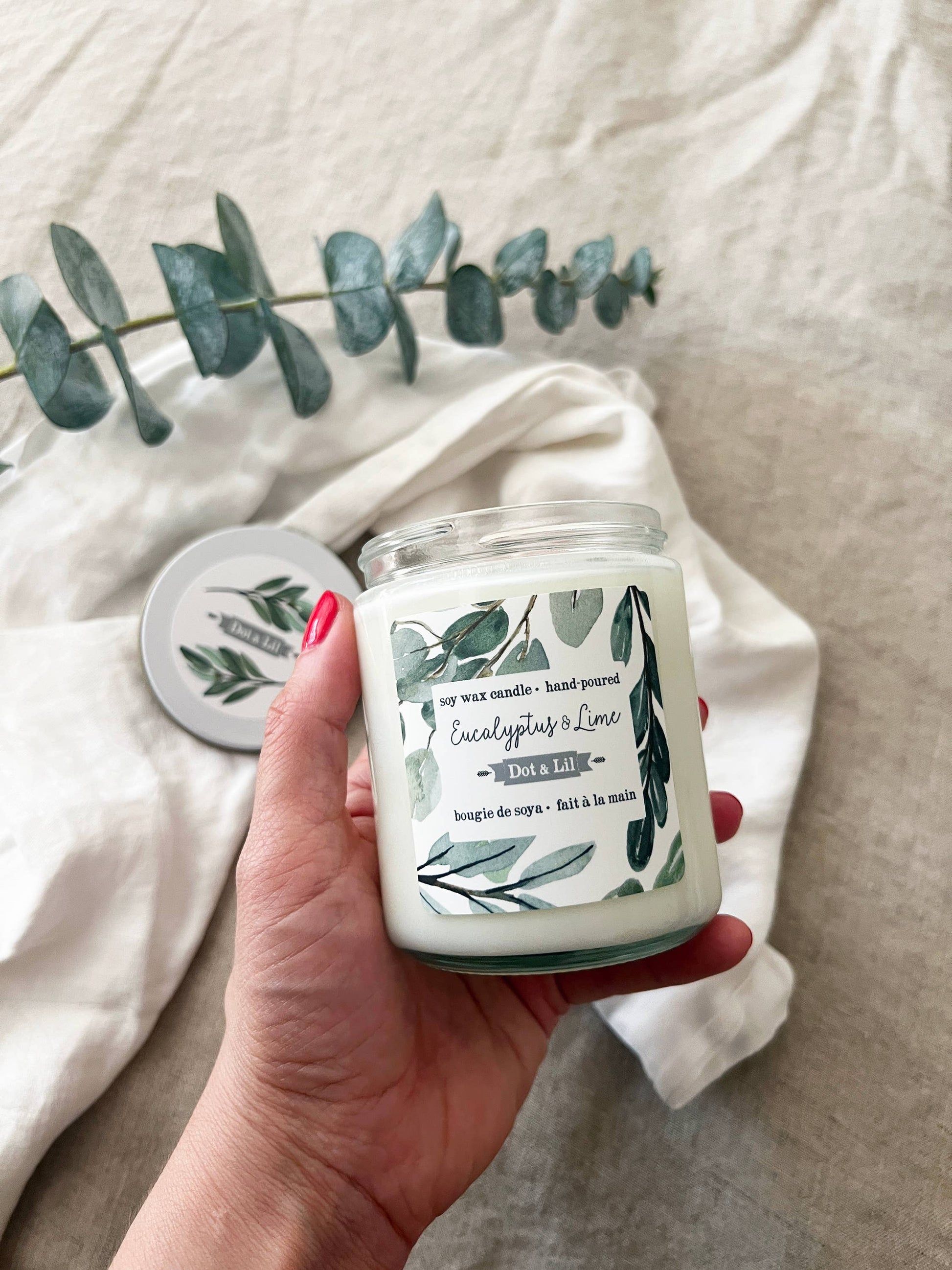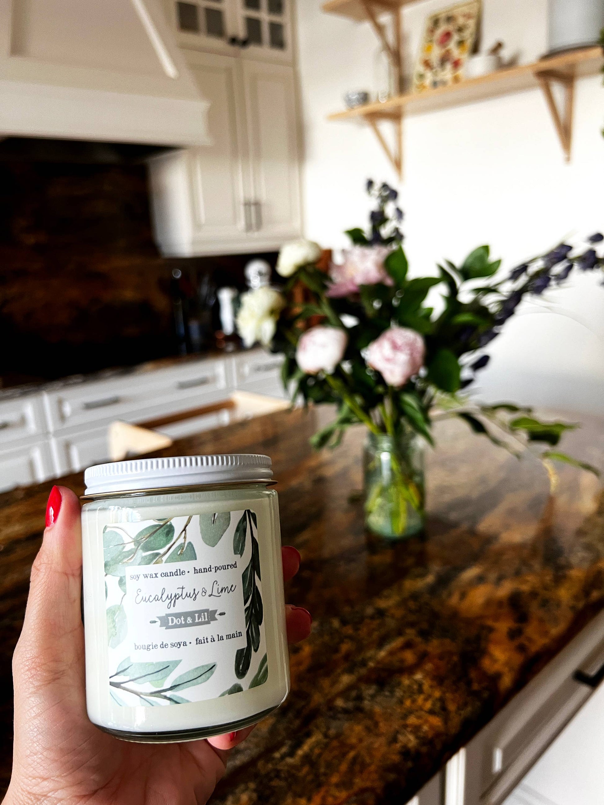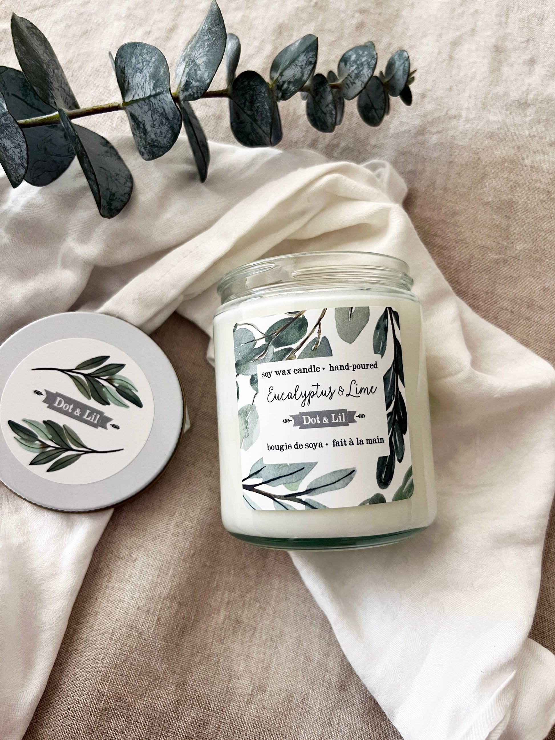 Dot & Lil’s finely hand-poured candles are made with a wax blend of 100% pure soy & botanical oils, with a cotton wick. Each candle is hand-poured in a glass jar with white metal lid, and comes with beautiful patterned box. Burns for 45 hours 7.2 oz