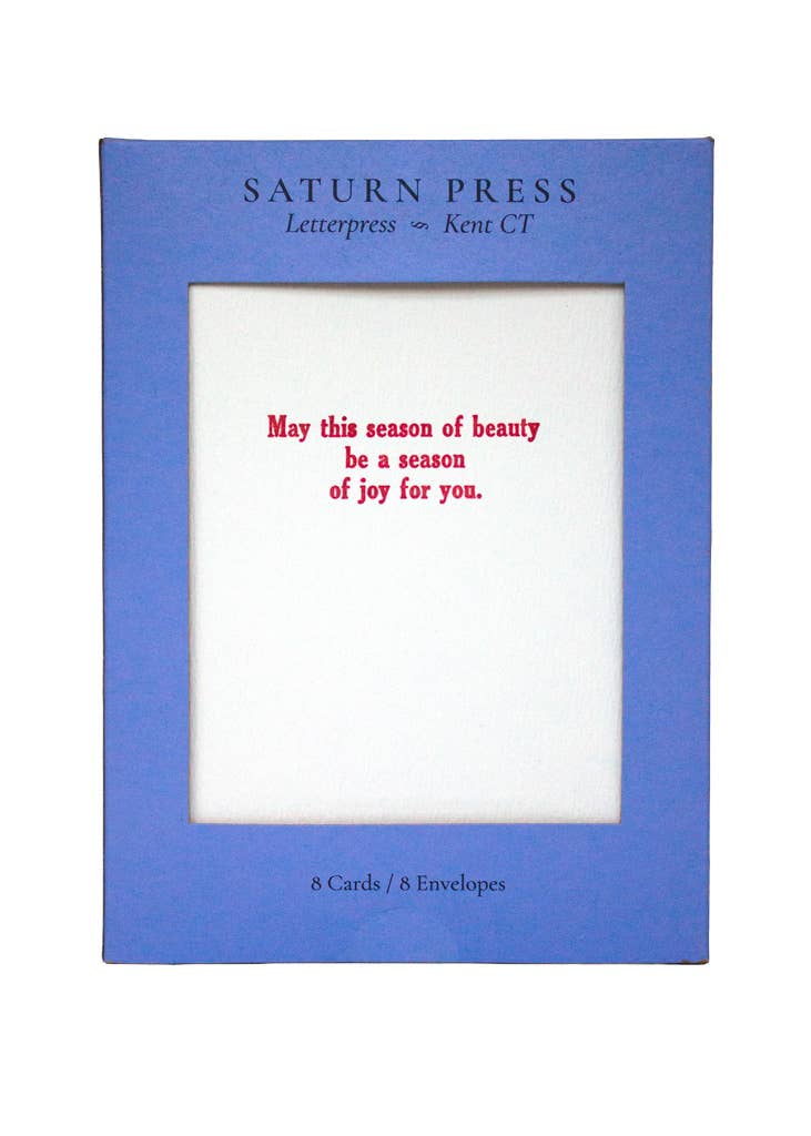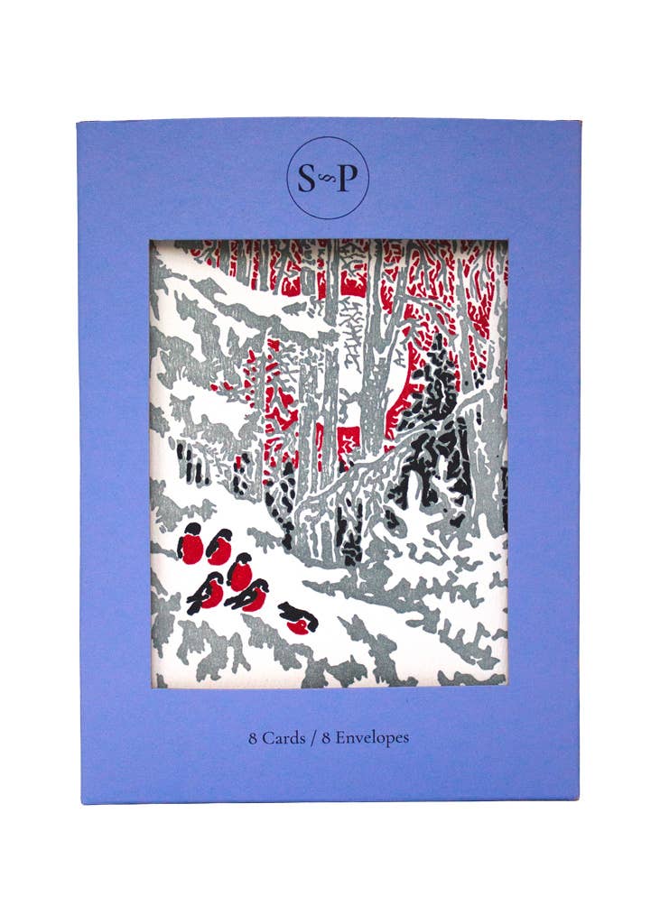 Rich red bullfinches nestled among snow-laden evergreen branches create a captivating scene that celebrates winter's natural beauty. This letterpress card combines traditional holiday colors with an artistic, hand-drawn aesthetic that feels both classic and contemporary. Blue box of eight letterpress cards and matching envelopes. Letterpress printed. Deckle edged paper.