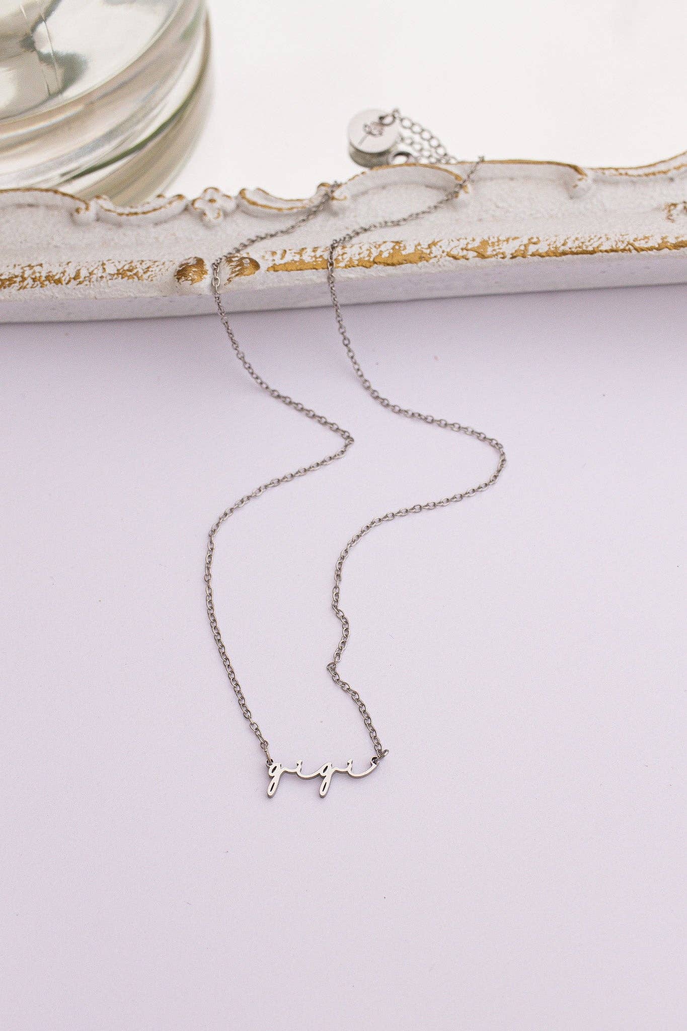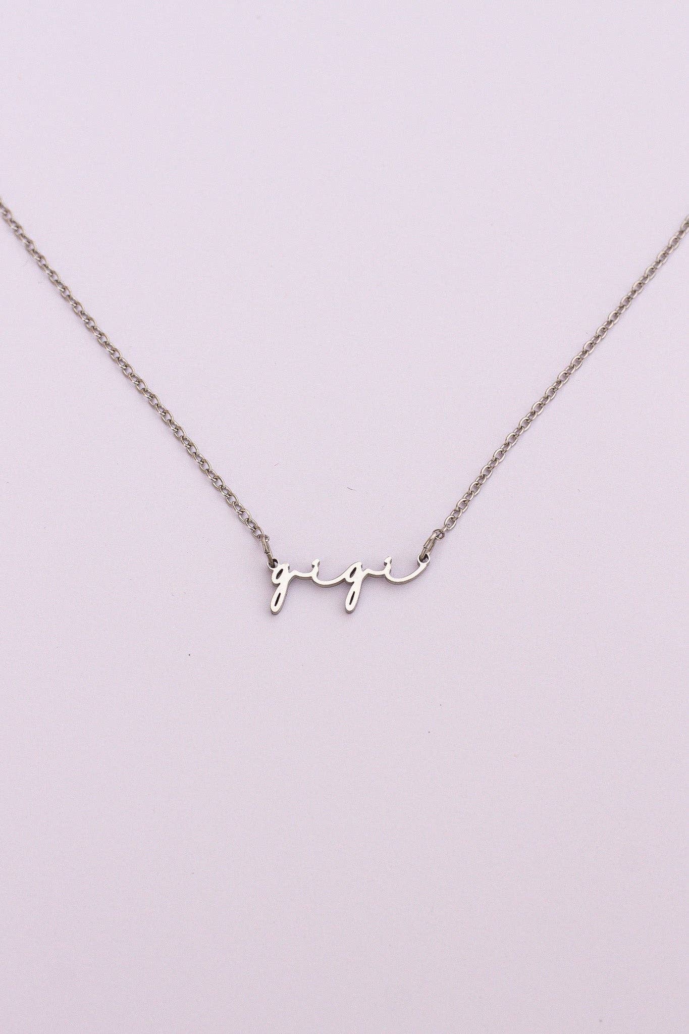 Meet the Gigi Necklace! A perfect little dainty piece featuring "gigi" written out in cursive script font. Tarnish Free & Waterproof - Shower, Sweat and Pool Safe. Hypoallergenic and Sensitive Skin Safe. 18k Gold Plated Stainless Steel. Adjustable from 16-18.5 inches in length.