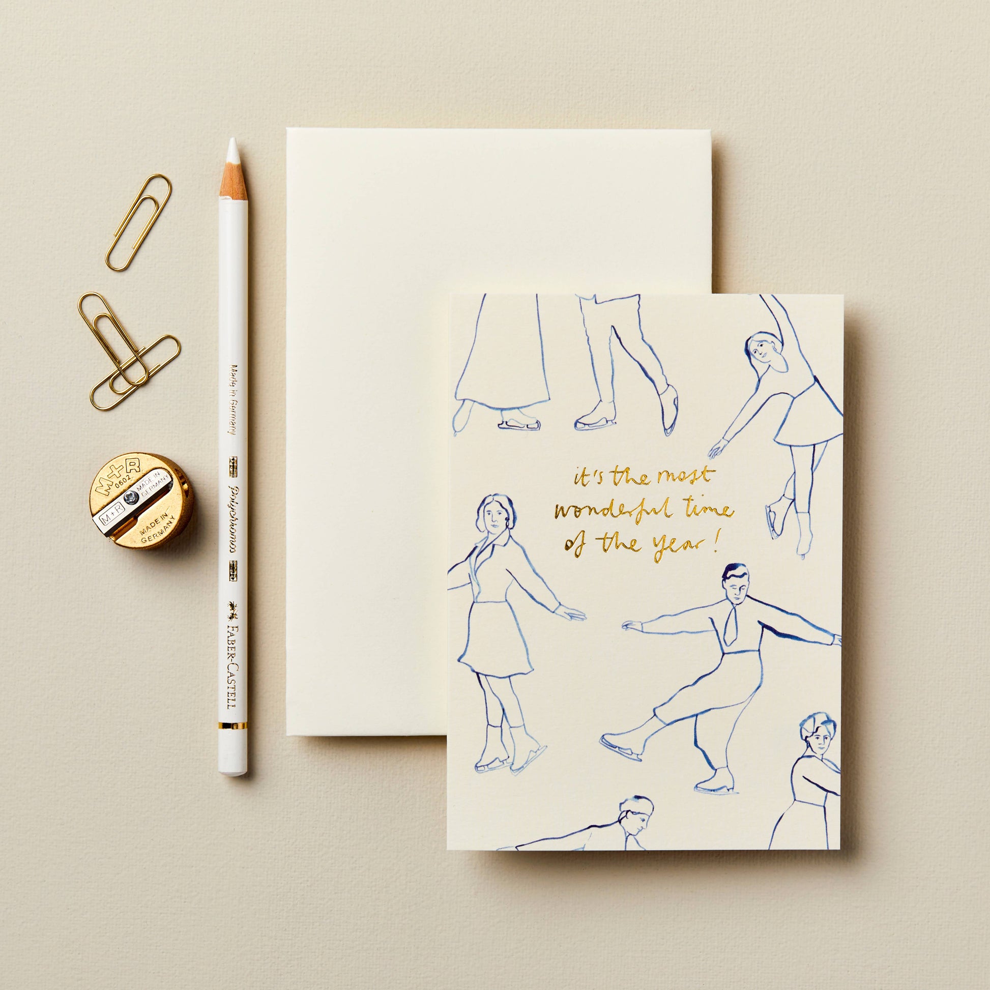 A cream card featuring a blue ice skater print and a golden foil greeting. This card features golden foil on the front and back of the card, and is paired with a luxury cream envelope. Printed in the UK on FSC certified papers