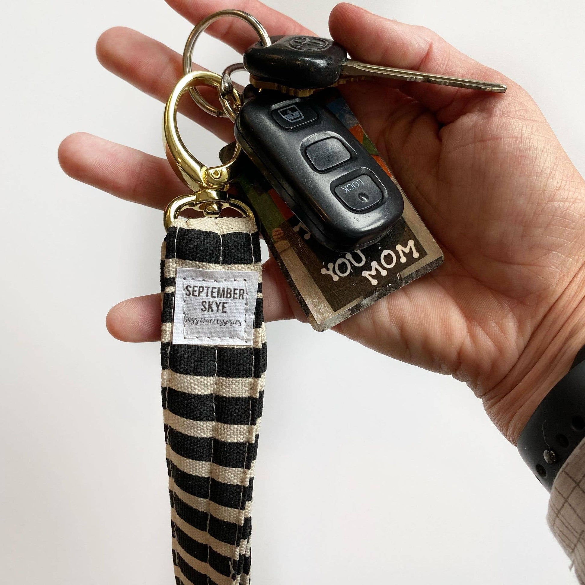 Fabric key fob in beautiful rifle paper prints. Can work as a keychain or wrist strap for a clutch or coin purse. Approximately 7" long. Large chunky gold hardware.