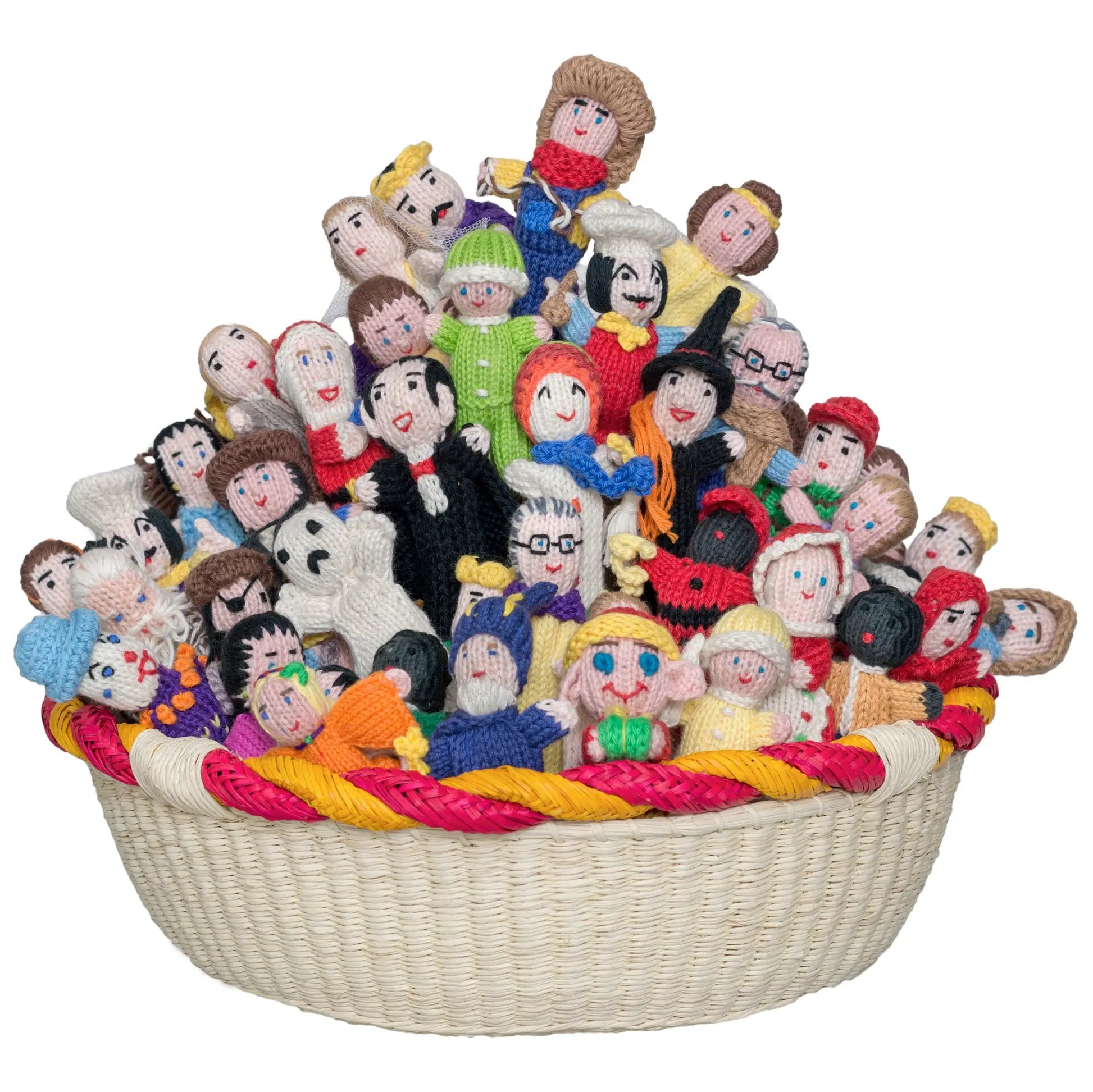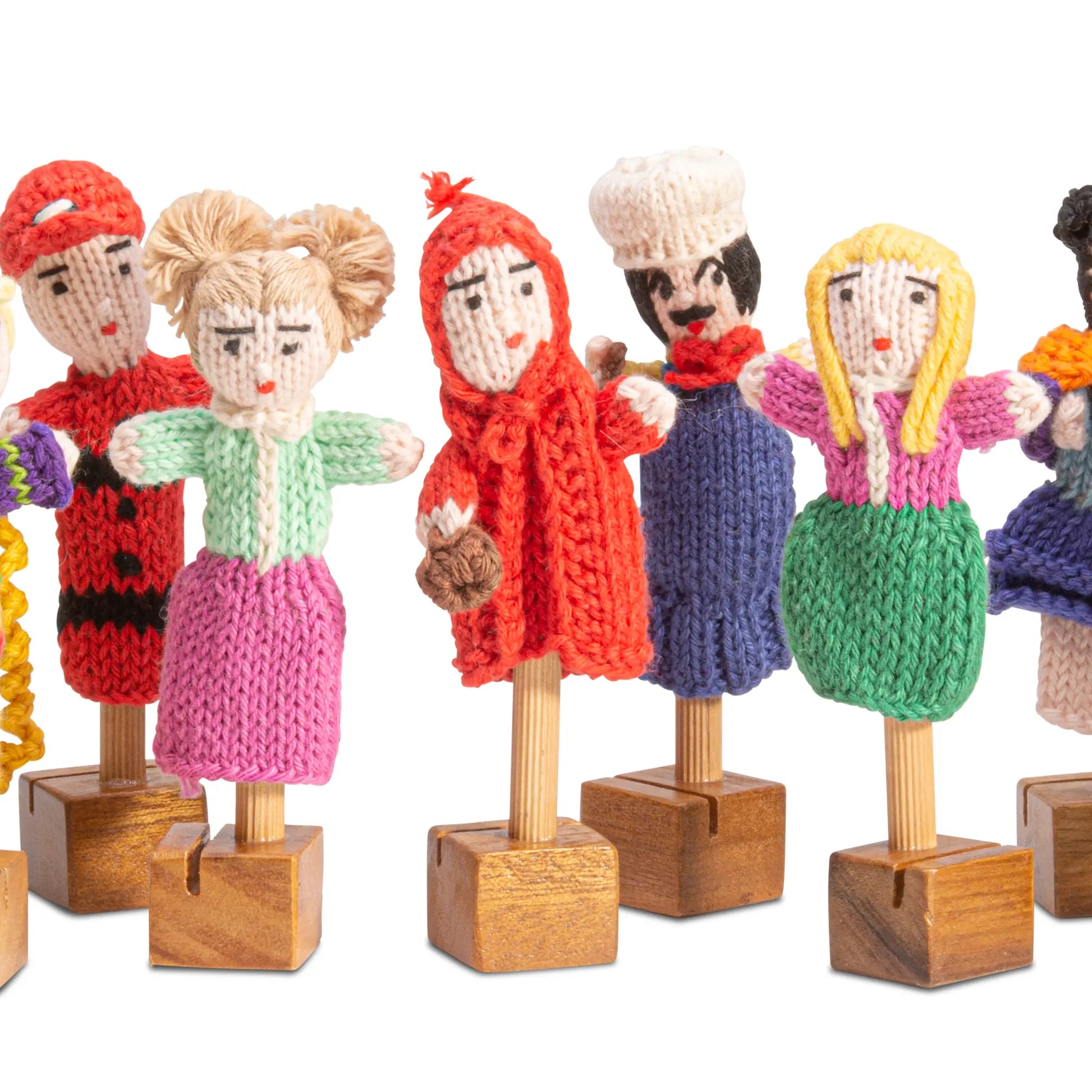 These 100% organic cotton People finger puppets are skillfully hand-knitted by women in the Andes of Peru.