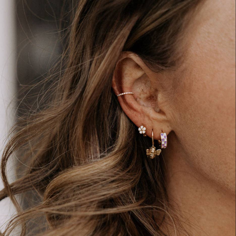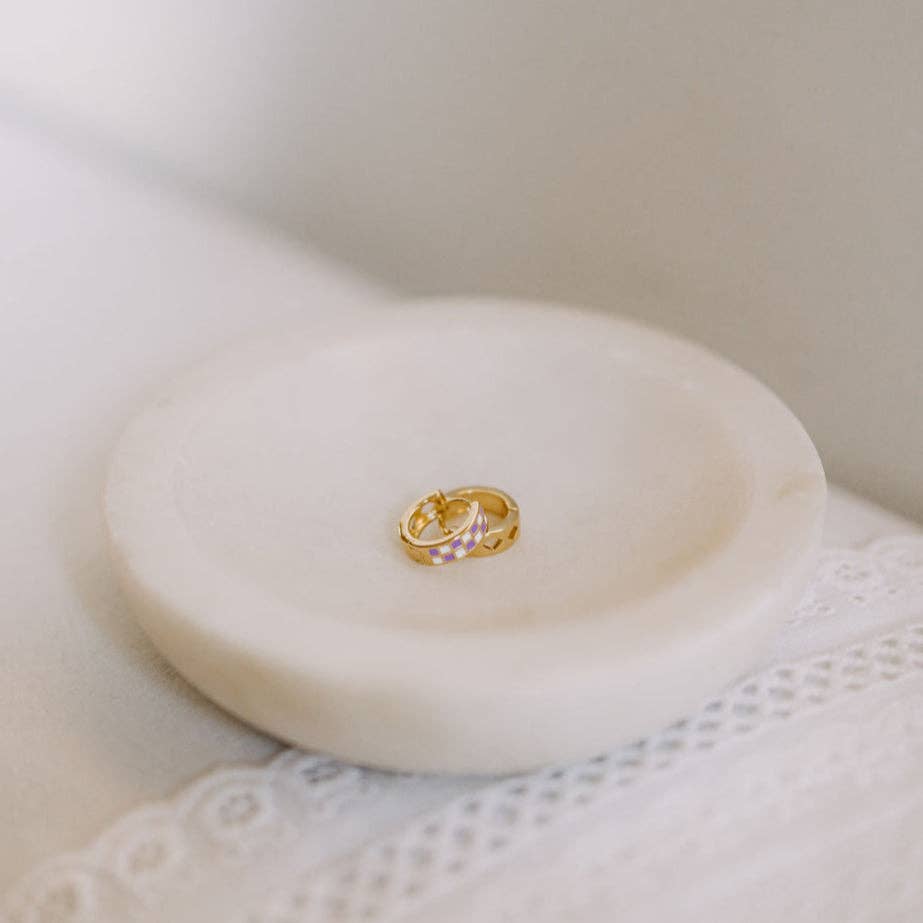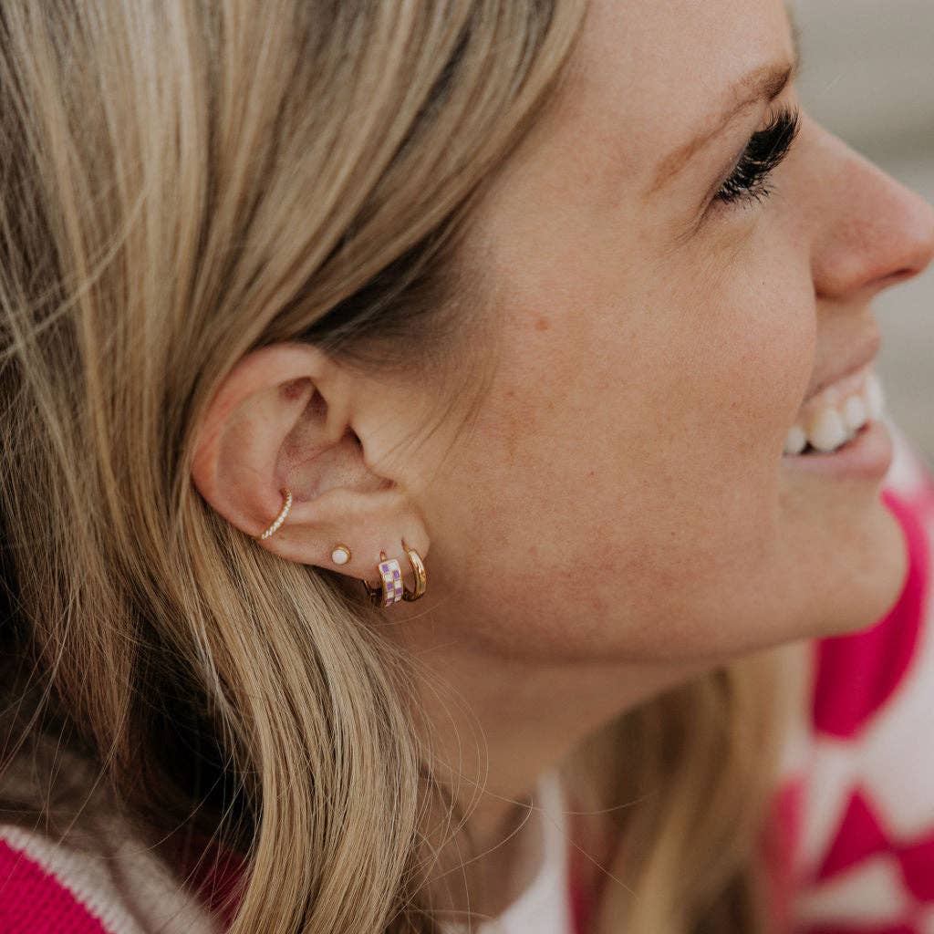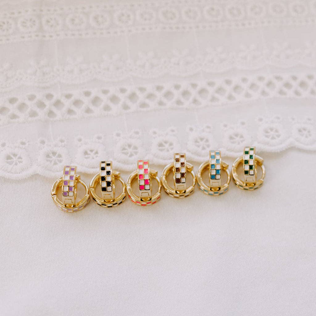 The Purple & White Checkered Hoops are made of high quality gold fill and are hypoallergenic and good for sensitive ears. They have a huggie closure style and are the cutest new jewelry trend! Outer diameter is 10mm. Available in multiple colors.