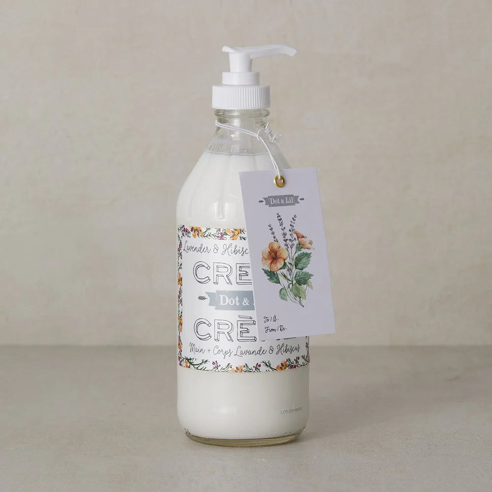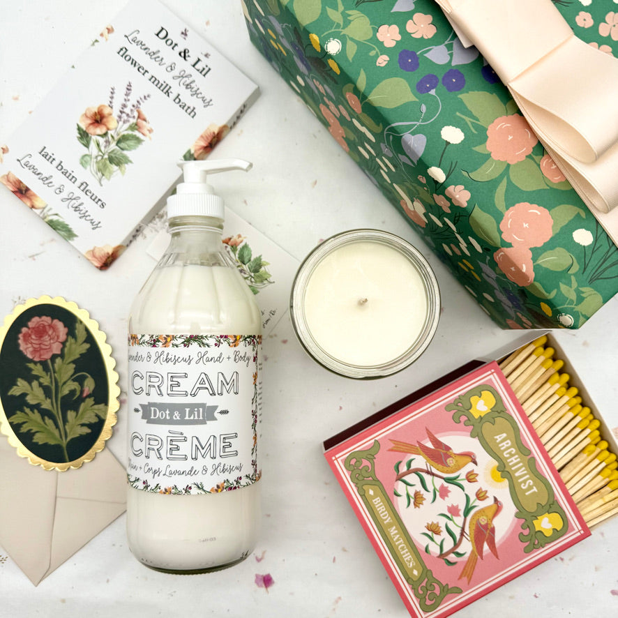Indulge and pamper with our luxurious bath and body set featuring the calming scents of lavender and hibiscus from the Dot and Lil atelier. Complete the experience with luxury matches and gold foiled mini card. All beautifully wrapped in one of our gorgeous papers for a truly special experience. Treat a loved one to the ultimate self care indulgence.Â