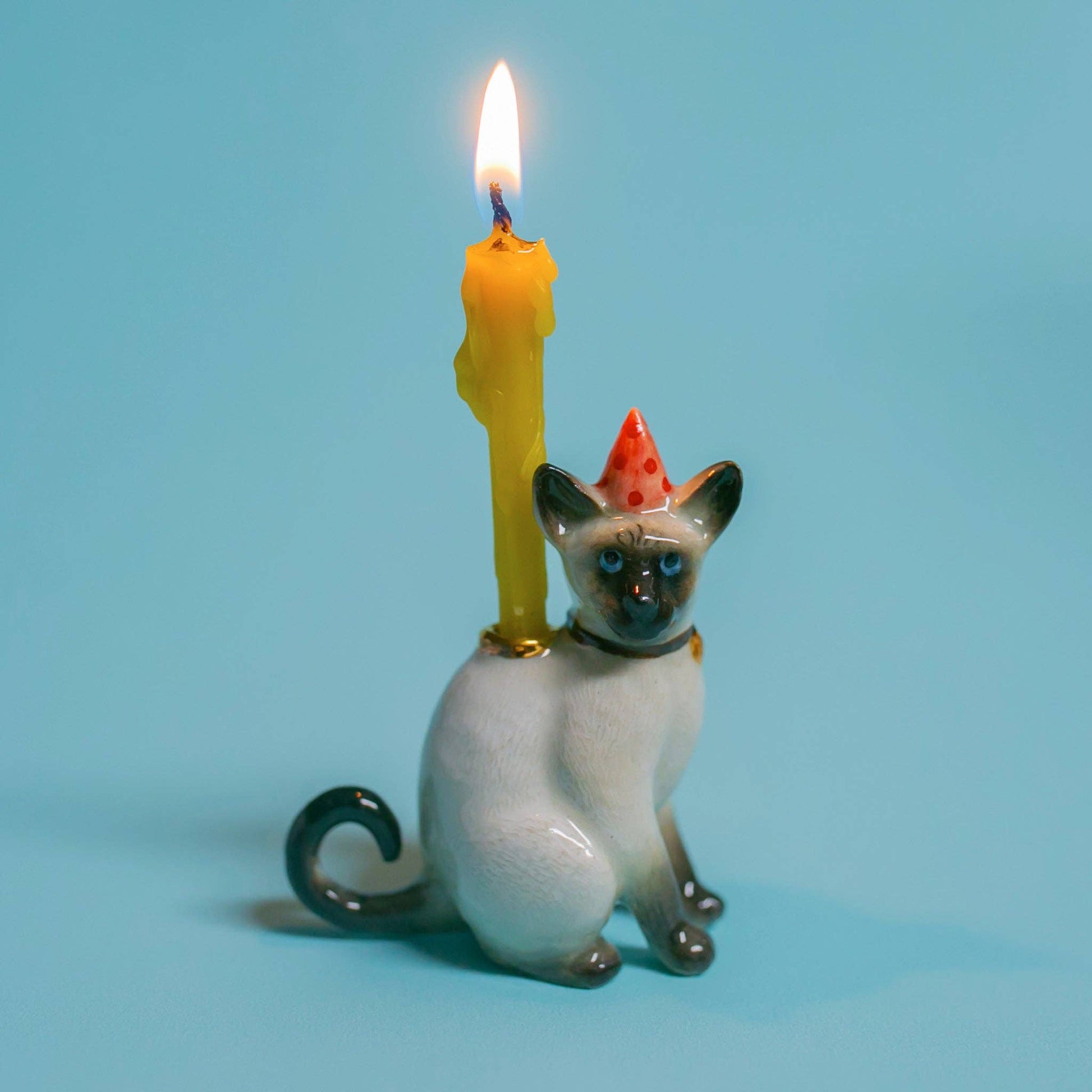 The Siamese Cat Cake Topper from Camp Hollow adds a delightful touch to any cake. This charming topper features a beautifully detailed Siamese cat wearing a festive party hat and sitting next to a lit candle. Crafted from high-quality, food-safe materials, it is perfect for birthdays, cat-themed parties, and special occasions. The lifelike design and intricate details make it a memorable keepsake long after the event. Make your celebration extra special with this adorable and unique cake topper.