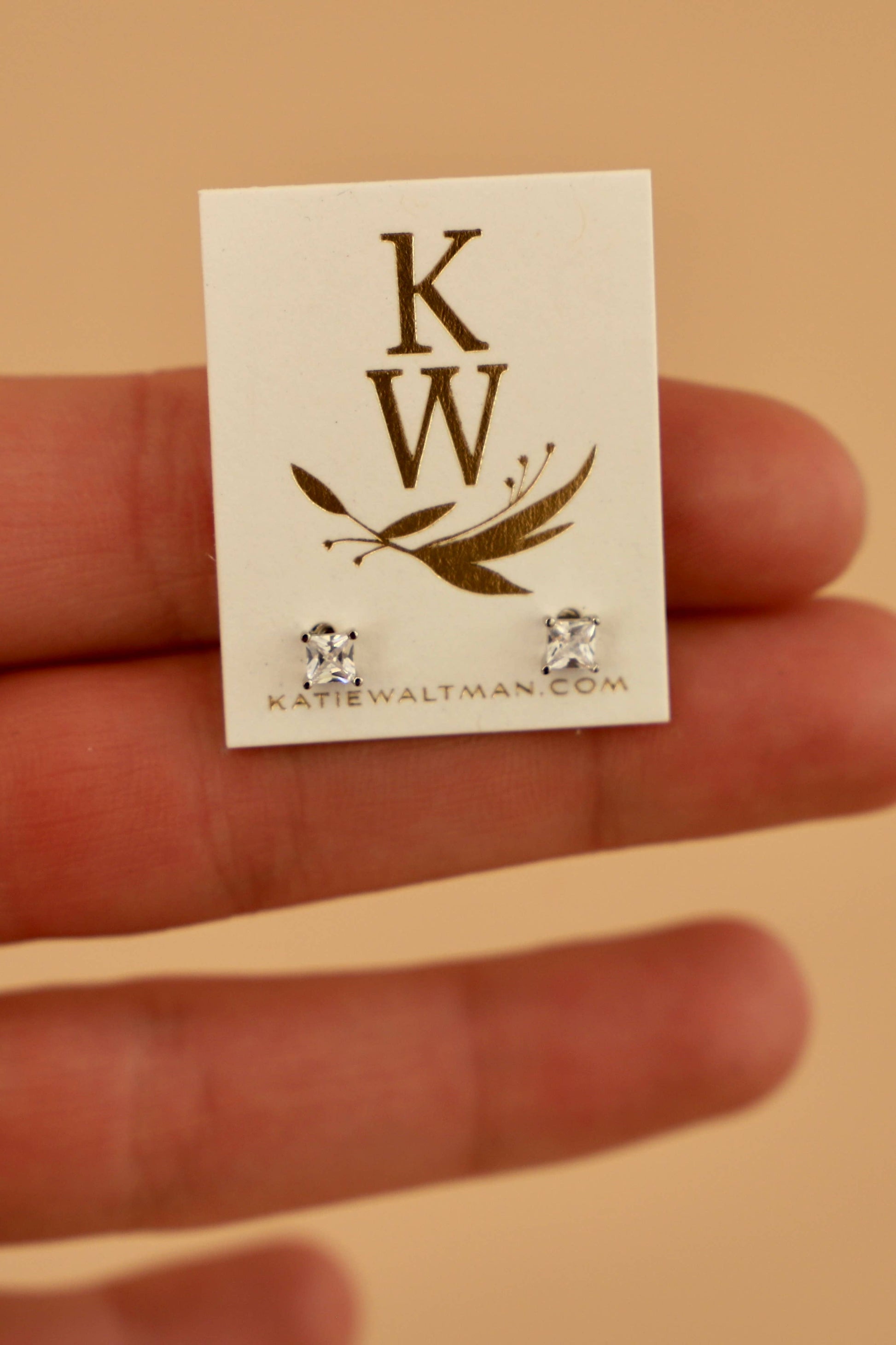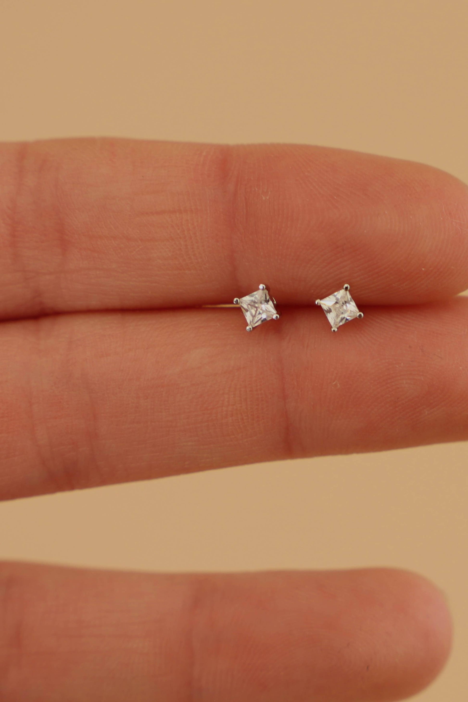 Silver square CZ studs are a timeless stud that pairs beautifully with all other earring styles. Measurement: 3 mm Materials: Silver plated brass. Cubic zirconia