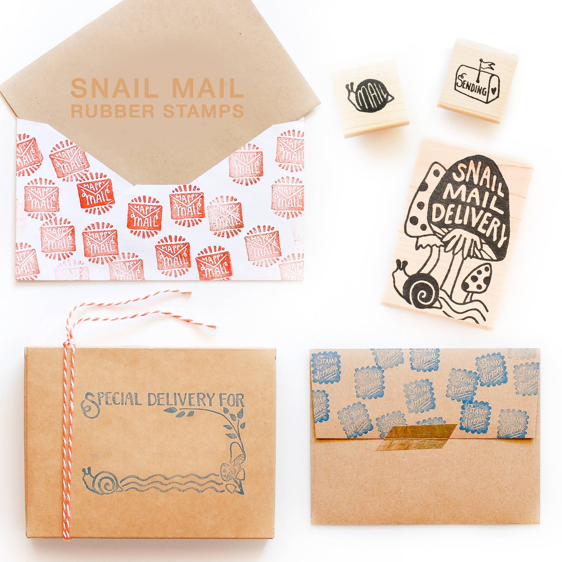 This hand-illustrated Snail Mail stamp is simple and fun and would probably be a good addition to any snail mail envelope! Made in the USA. Size: 1¼ in x 1¼ in Red rubber stamp mounted on Maple Hardwood