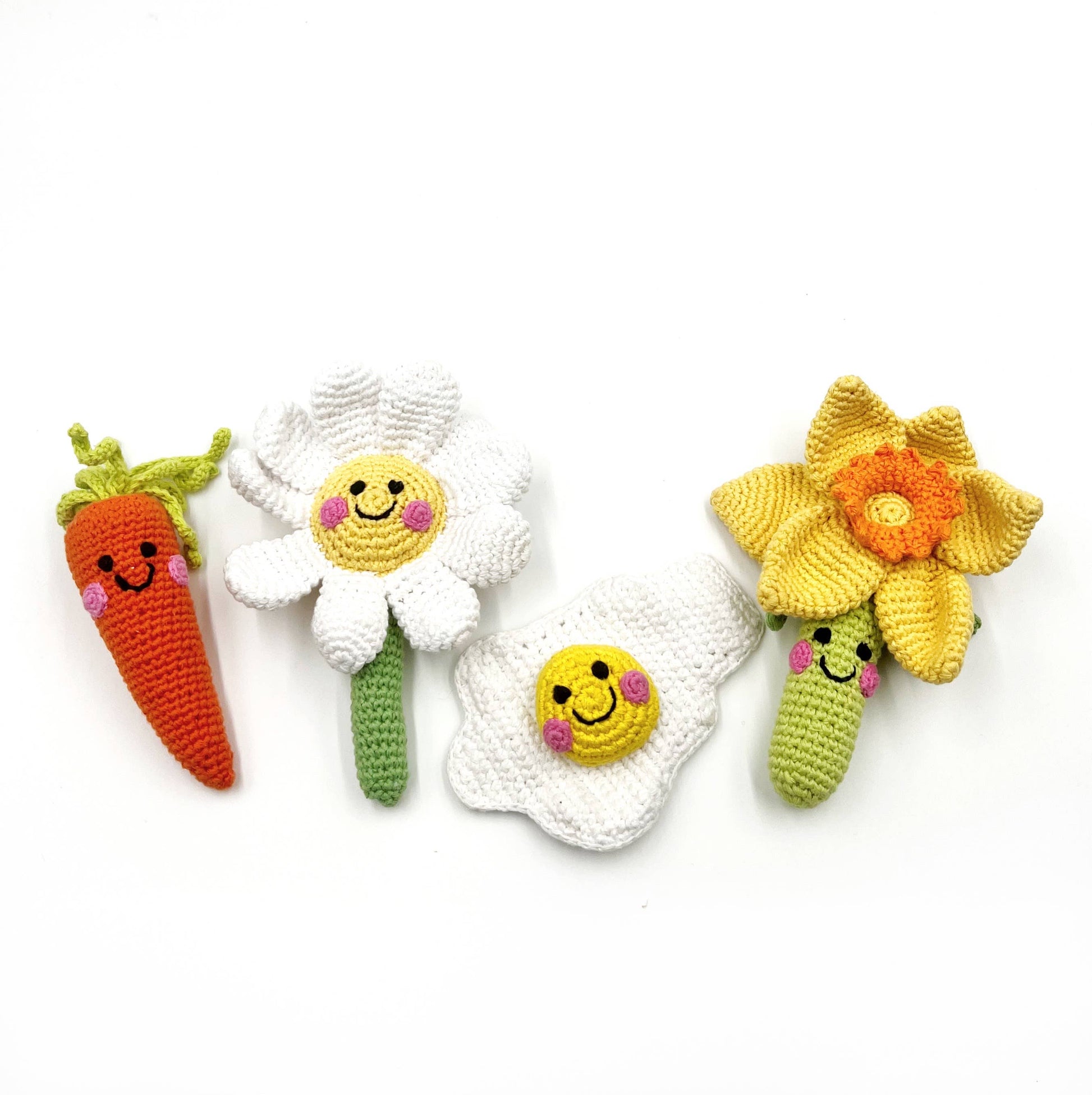This happy little daffodil toy brings a bright pop of color to Easter baskets and a promise of spring. The bright green stem is just the right size for tiny hands to grab and the rattle inside gives a very soft jingle when shaken. Washable. Made by women in Bangladesh, allowing them to bring their children to work and giving them an alternative source of income.Â