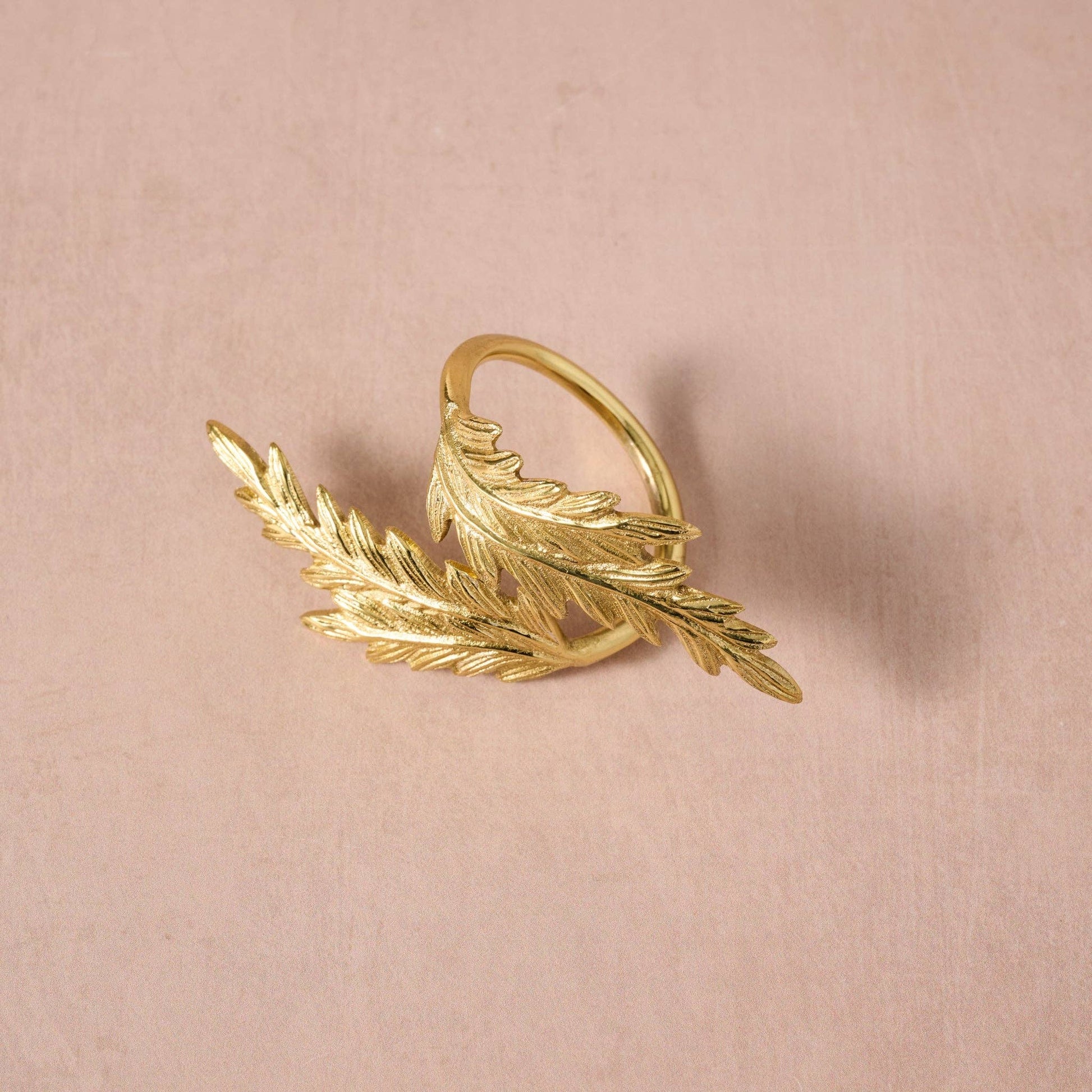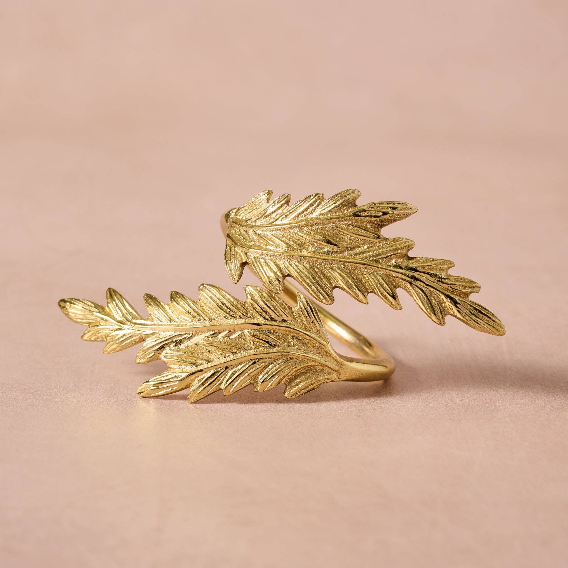 Sunkissed fields flush with the bounty of life-nurturing wheat are the inspiration for these striking napkin rings. Crafted from warm brass, each open-ended ring wraps gracefully around your napkin like a golden sprig and celebrates harvest, hospitality and timeless design. Set of two. A Ten Thousand Villages Exclusive handcrafted in India by the artisans of Craft Resource Center Pvt. Ltd. (CRC), a guaranteed Fair Trade Organization creating sustainable income opportunities for marginalized communities by blending traditional skills and ethical practices with globally competitive design, quality and innovation while preserving the dignity of labor and empowering artisans through fair trade, technology and skill development. Material: Brass - Measures: 2.75"L x 2.25"W - Color: Brass - Handcrafted in India