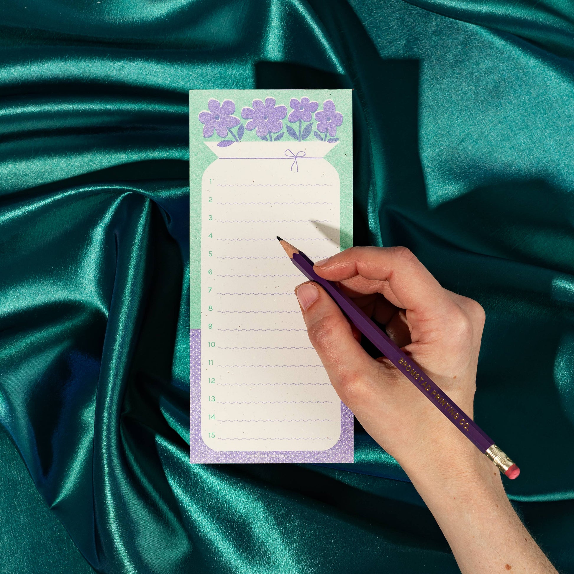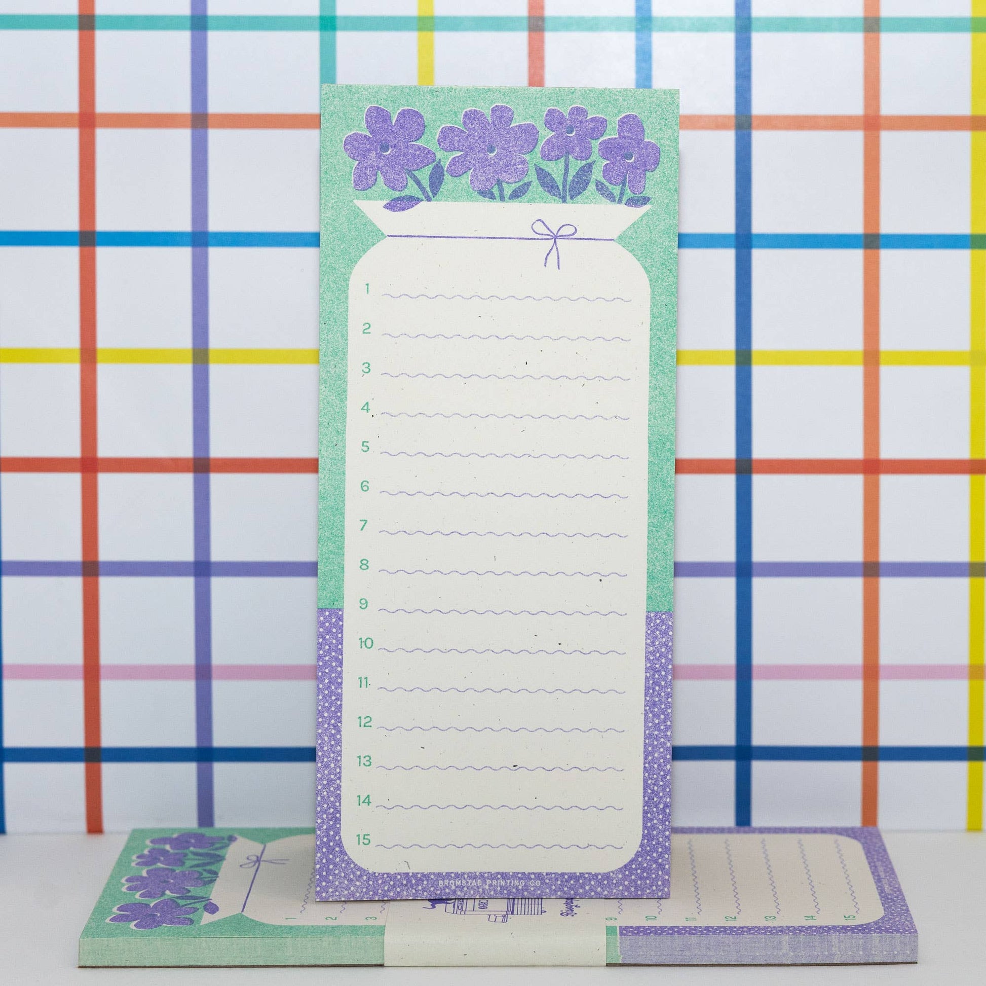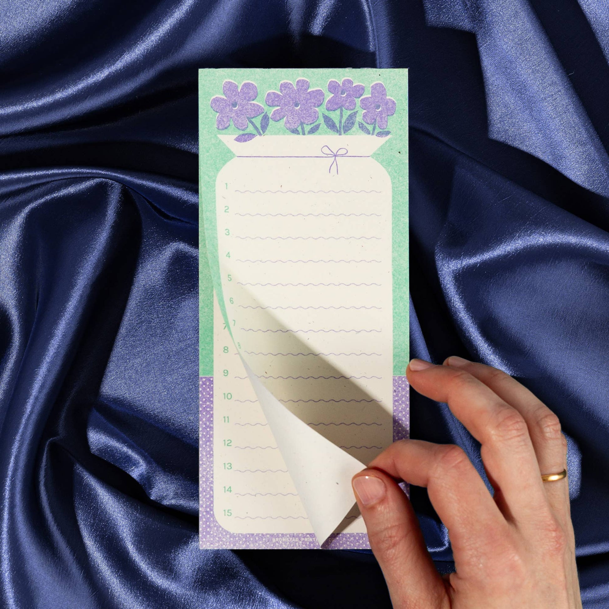A cheery vase of flowers is ready for your numbered lists! Risograph printed in seafoam and violet. 50 tear-off pages 3.5"x8" Paper belly band packaging, no sleeve Risograph printed with eco-friendly, vegetable-based ink 100% recycled, FSC-certified paper