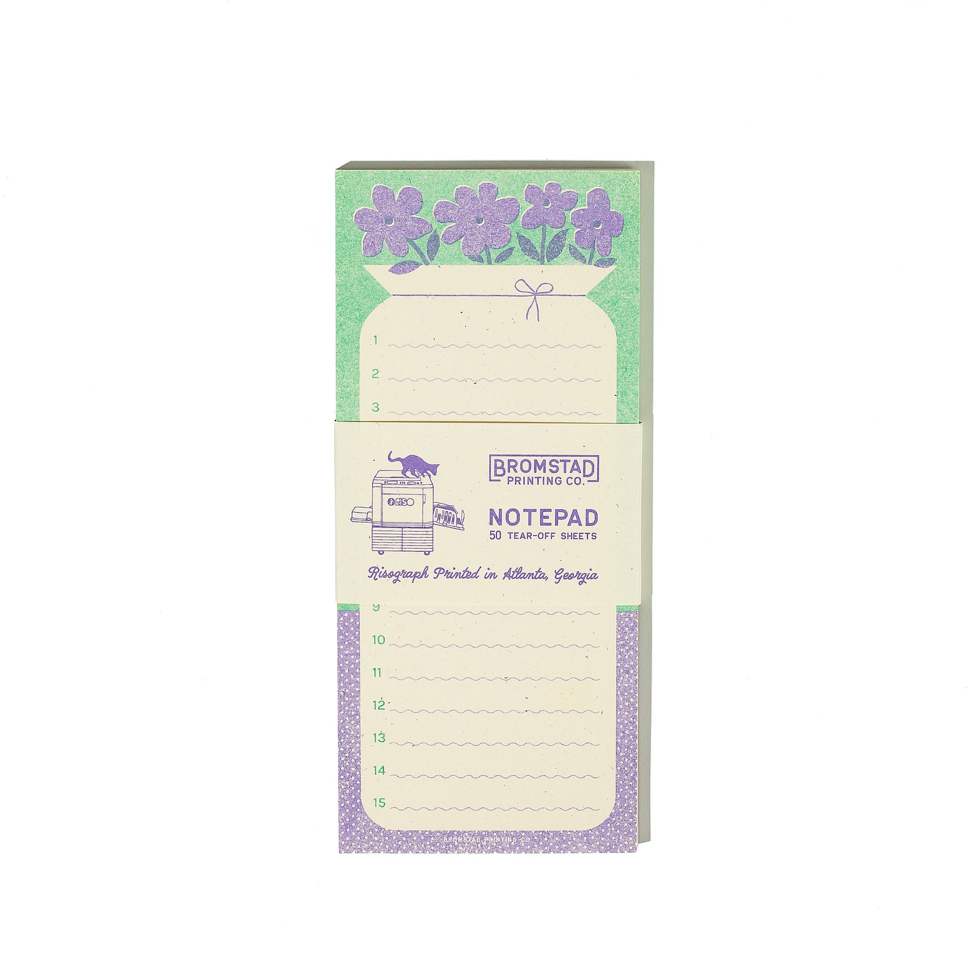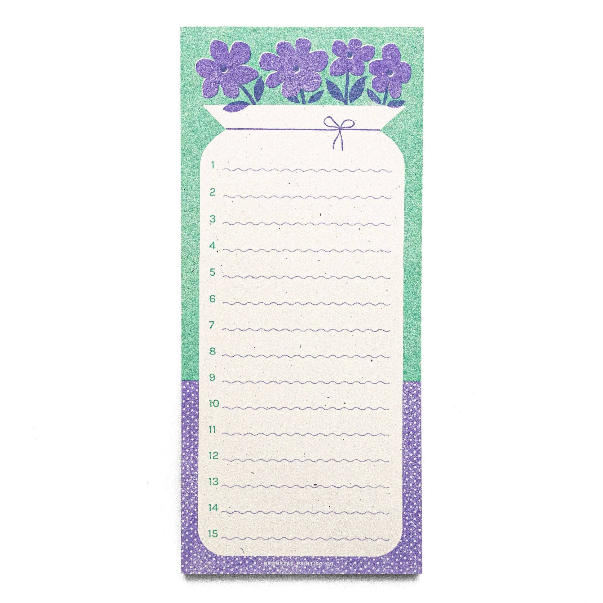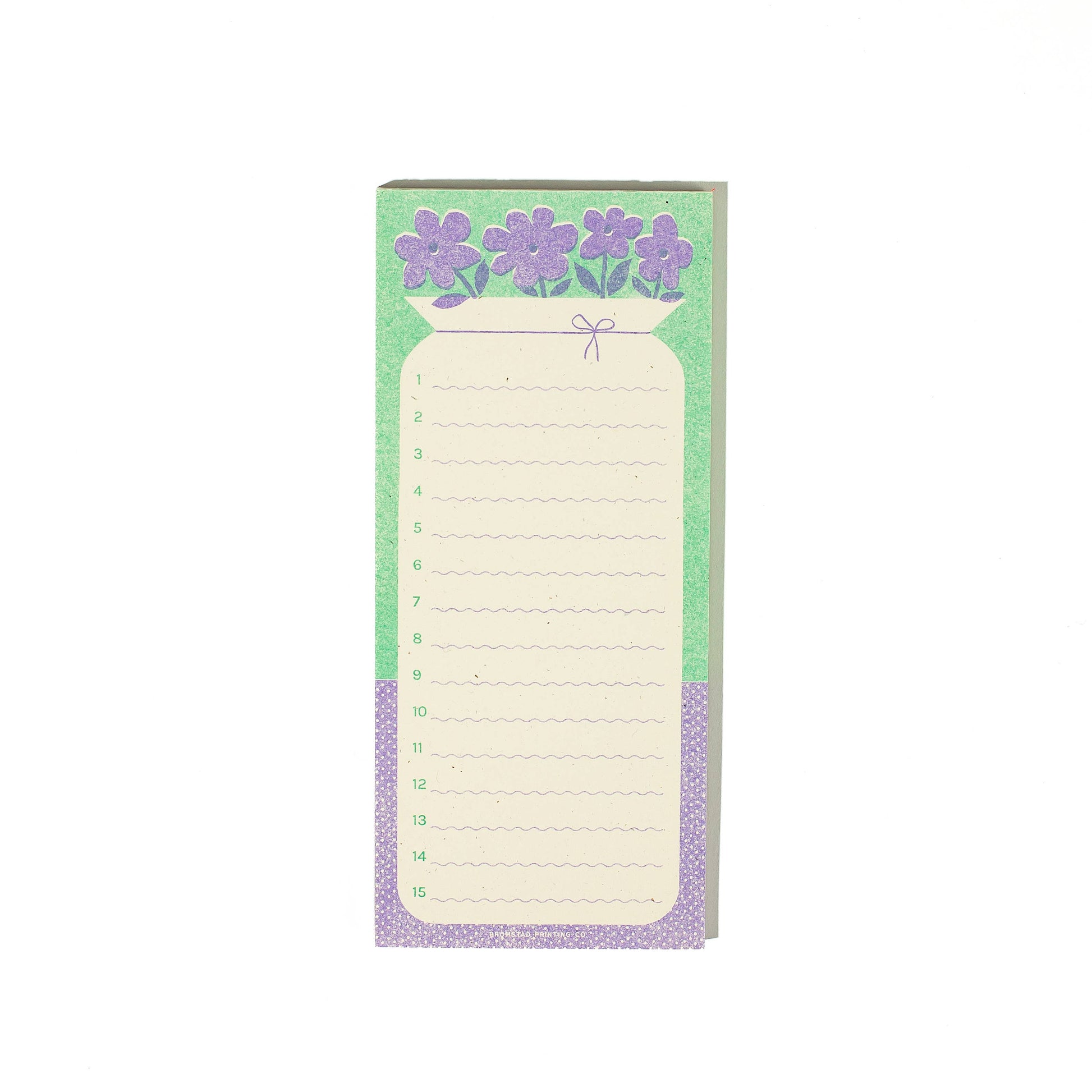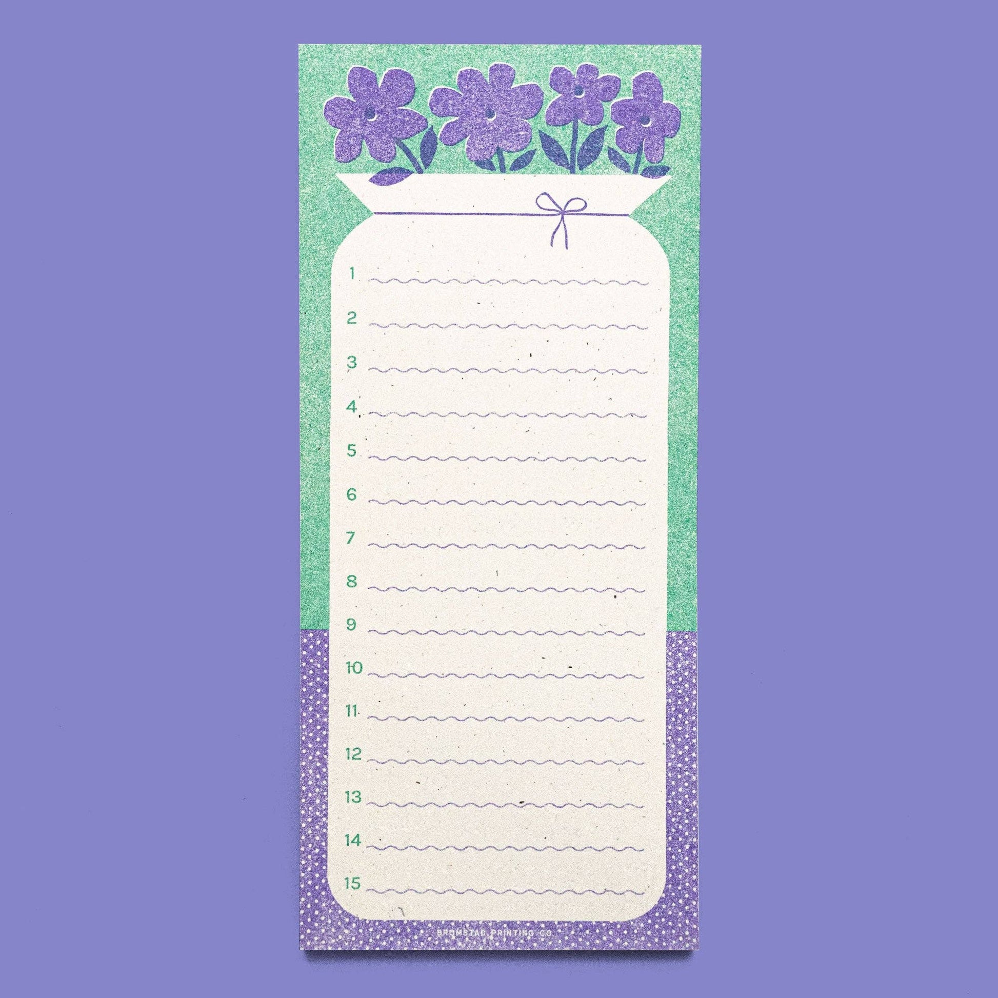 A cheery vase of flowers is ready for your numbered lists! Risograph printed in seafoam and violet. 50 tear-off pages 3.5"x8" Paper belly band packaging, no sleeve Risograph printed with eco-friendly, vegetable-based ink 100% recycled, FSC-certified paper