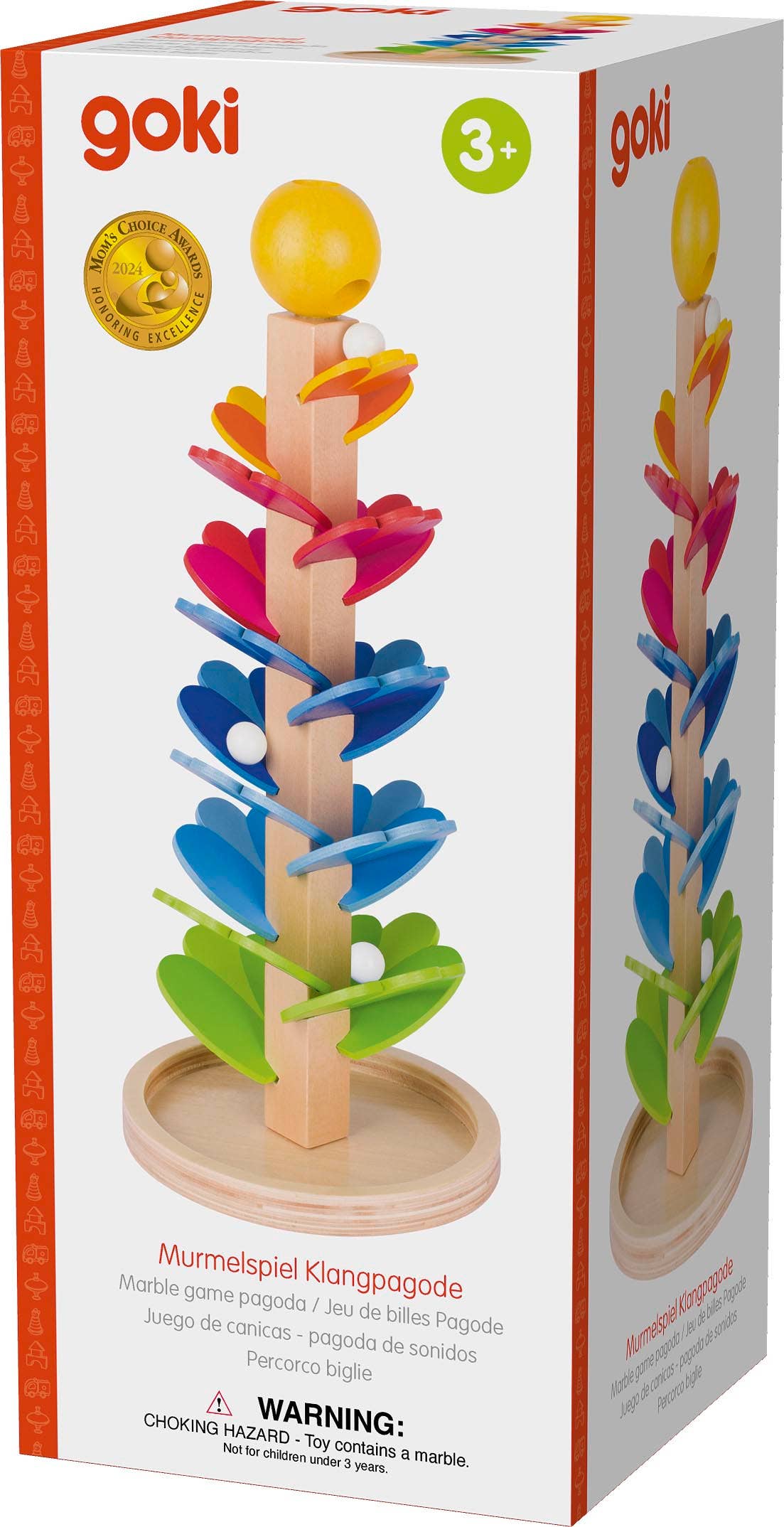 A symphony of colors and sounds elevate playtime with this mesmerizing marble run pagoda. Standing 15 inches tall, this beautifully crafted wooden tower features vibrant, rainbow-hued leaf-shaped tracks that guide glass marbles on a spiraling journey. As they descend, the marbles create a delightful melody, engaging both visual and auditory senses. Perfect for developing fine motor skills, hand-eye coordination, and color recognition in children aged 3 and up.
