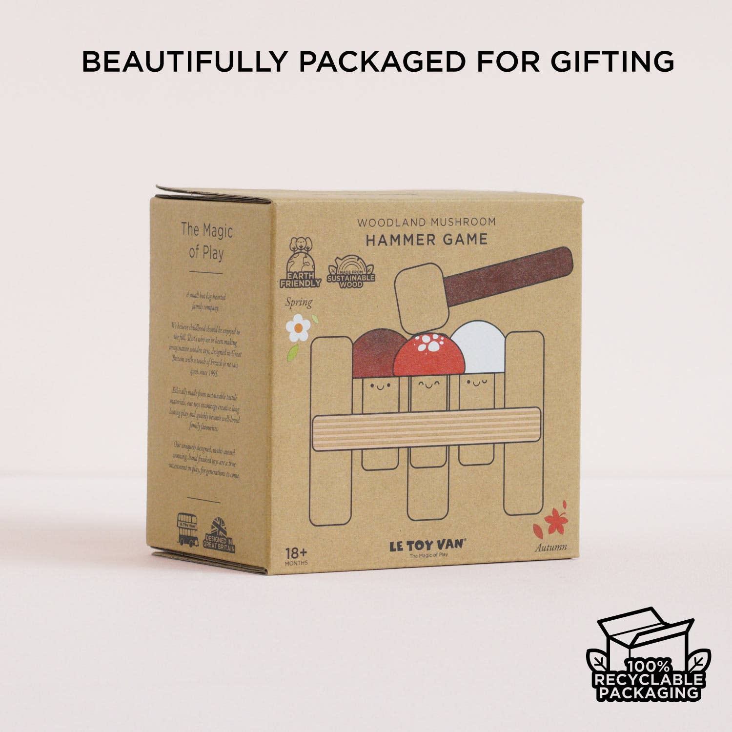 This super cute hammer toy is a fun twist on a classic. The adorable nature design is sure to be a hit, featuring a playful woodland themed base and 3 sweet mushrooms set in a circle, complete with a hammer. A delightful toy, it will inspire may hours of play as little learners hammer the mushrooms into the holes; for day after day play. A perfect toy to help develop & dexterity and improve hand eye co-ordination. Crafted using solid wood, ethically made and Made of FSC®-certified wood and painted with child safe, water based paints. Recommended for ages -18 months+ Dimensions - 17.5 x 17 x 10cm Multi-sensory toy Aids development of fine motor skills through play Made of FSC®-certified wood Ethically made with love Decorated with child safe, water based paints