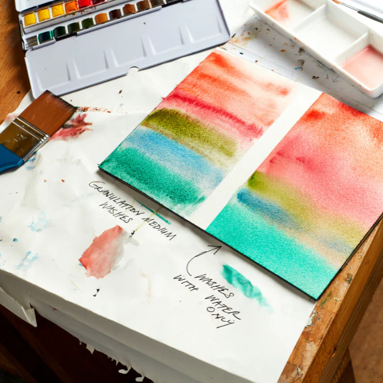 A low-viscosity formula, that increases the granulation of color, giving a natural mottled appearance to colors which usually give a smooth wash (e.g. Winsor Blue), or enhancing the effect of granulating colors (e.g. French Ultramarine). For maximum effect dilute color generously with medium alone. 75ml bottle.